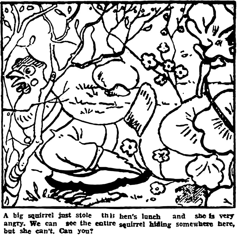 Hiding in this image is the squirrel who stole the hen's lunch. From the Bombay Sunday Chronicle, 1936.