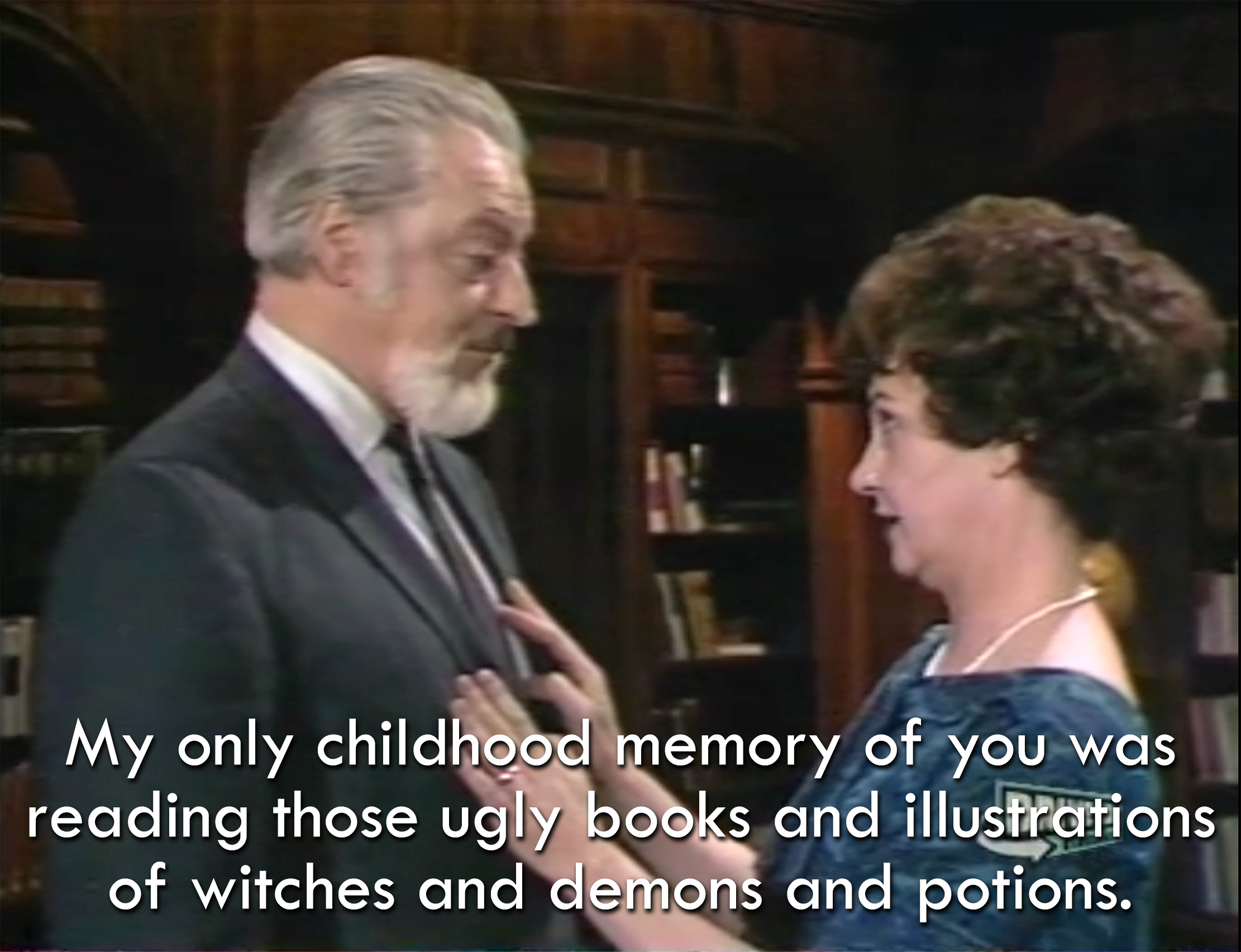 "My only childhood memory of you was reading those ugly books and illustrations of witches and demons and potions." From