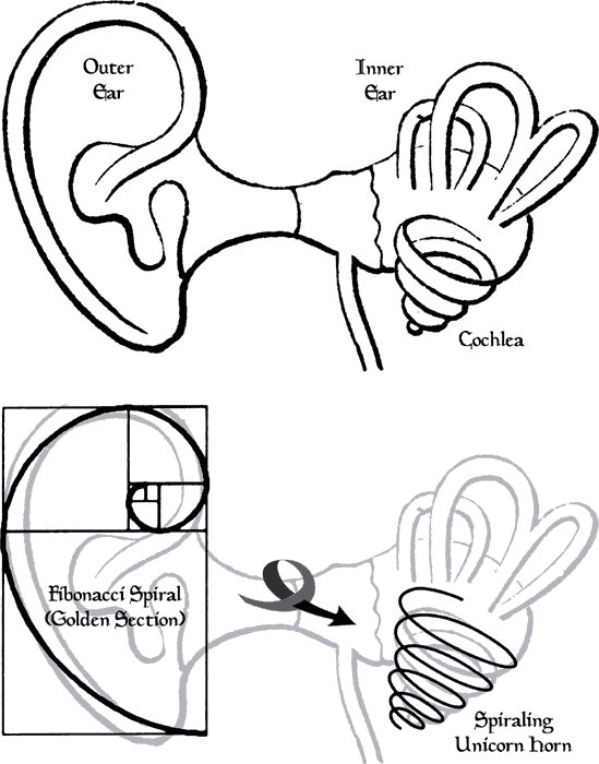 The human ear is naturally equipped to attune to the sounds of a unicorn. The outer ear follows the Fibonacci Spiral (a mathematical ratio ubiquitous throughout nature, from sunflowers to fingerprints to galaxies to unicorn horns). The spiral shape of the cochlea is the inner ear’s “unicorn antenna,” boosting low frequencies.