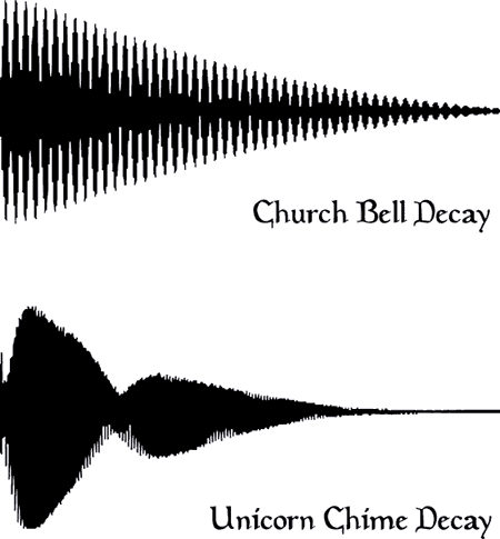 Compare the waveforms of two bell sounds. The vibrations (moving left to right through time) diminish in each, but with a difference. Notice the gradual, steady decay of the church bell. The unicorn chime, on the contrary, has an irregular decay. Its swelling waveform betrays an organic nature. Here we have two bell sounds with very different characters.