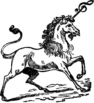 By the faint breath of movement before his face, the sudden sweet smell like the breath of a spring wind, he knew that the unicorn was nearby, invisible, watching him with wide eyes. —John C. Wright, The Last Guardian of Everness (2005) A rustle of leaves in the breeze. A subtle creaking of tree branches. (An eerie whinny?) A humming of insects. A chirping of songbirds. (A soft clomping of hooves?) Though they “aren’t as rare as you might think,”2 unicorns, like other retiring creatures of the forest, are often shrouded by their habitat. How many bird watchers have spied a warbler perched upon a tapered branch, never dreaming that the selfsame branch is, in actuality, a unicorn’s horn? Truth be told, far more unicorn herds are heard than are ever seen. Out of the gleeful chorus of wilderness creatures, the simplest way to pinpoint an elusive unicorn is to listen for its song. Here’s a secret: expert unicorn spotters can “see” more unicorns, per capita, with their eyelids shut than the average person can see with eyes wide open. That’s because they have an intimate friendship with the sounds unicorns make. As you concentrate with eyes closed and mind focused, you may detect the telltale song of the unicorn, announcing the presence of the venerable creature and beckoning you to begin your quest. When you open your eyes, the unicorn may not be immediately visible, but you’ll know where to start looking. Hearing a unicorn requires time, patience, and “deep listening” skill on the part of the human,3 and vocal projection on the part of the unicorn. Because we live in a highly visual world, we rarely exercise the full range of our hearing. Yet our ears can detect things that our eyes automatically neglect. By listening as opposed to looking, we can avoid overlooking. Practice can be richly rewarding, whether one is listening for unicorns in particular or neglected delights in general. This compact yet comprehensive guide will help you to identify the various calls of the mysterious unicorn as it frolics in its natural environment. Along the way, you will become better acquainted with unicorns’ habits, eccentricities, antics, attitudes, and manners. Before you know it, encountering unicorns will become second nature to you, and you will have collected a treasure-trove of observations, anecdotes, snapshots, sketches, and memories for your unicorn scrapbook! A few preliminary listening tips are in order: 1. Sit for a spell. Contrary to popular belief, there’s no need to wear camouflage or to hide, at least as far as the unicorn is concerned. (If, however, you feel more comfortable wearing camouflage or hiding, you may do so without ill effect.) If you are still, relaxed, and “at one with nature,” the typical unicorn won’t be frightened. Find a comfortable place, such as under a tree, and allow yourself to “tune in” to the environment. After a few minutes, you’ll notice a marked refinement in your hearing—you’ll pick up on subtle auditory changes. 2. Since the human field of vision is less than 180°, there are great odds that a unicorn will approach from one of your many blind spots. Close your eyes and practice being aware of sounds coming from different directions, especially from behind you. One of the advantages of hearing over sight is that our ears offer a 360° scope. 3. Birdsong will likely be prominent in the soundscape, so practice listening beyond it to more subtle noises. Undue attention to birds when listening for unicorns is the sensory equivalent of overindulging in hors d’oeuvres and thereby spoiling one’s appetite for dinner. 4. Experiment with listening at different times of day, as unicorns can have unpredictable schedules. Sunset and midnight are recommended listening times. So is the break of dawn: