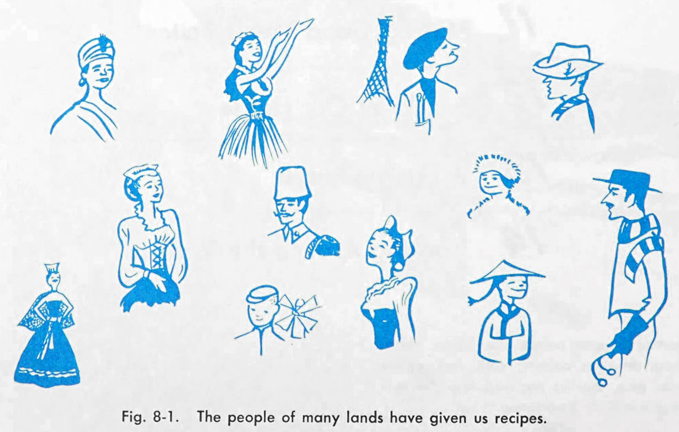 "The people of many lands have given us recipes."  From Home and Family Living by Fleck, Fernandez & Munves, 1959.