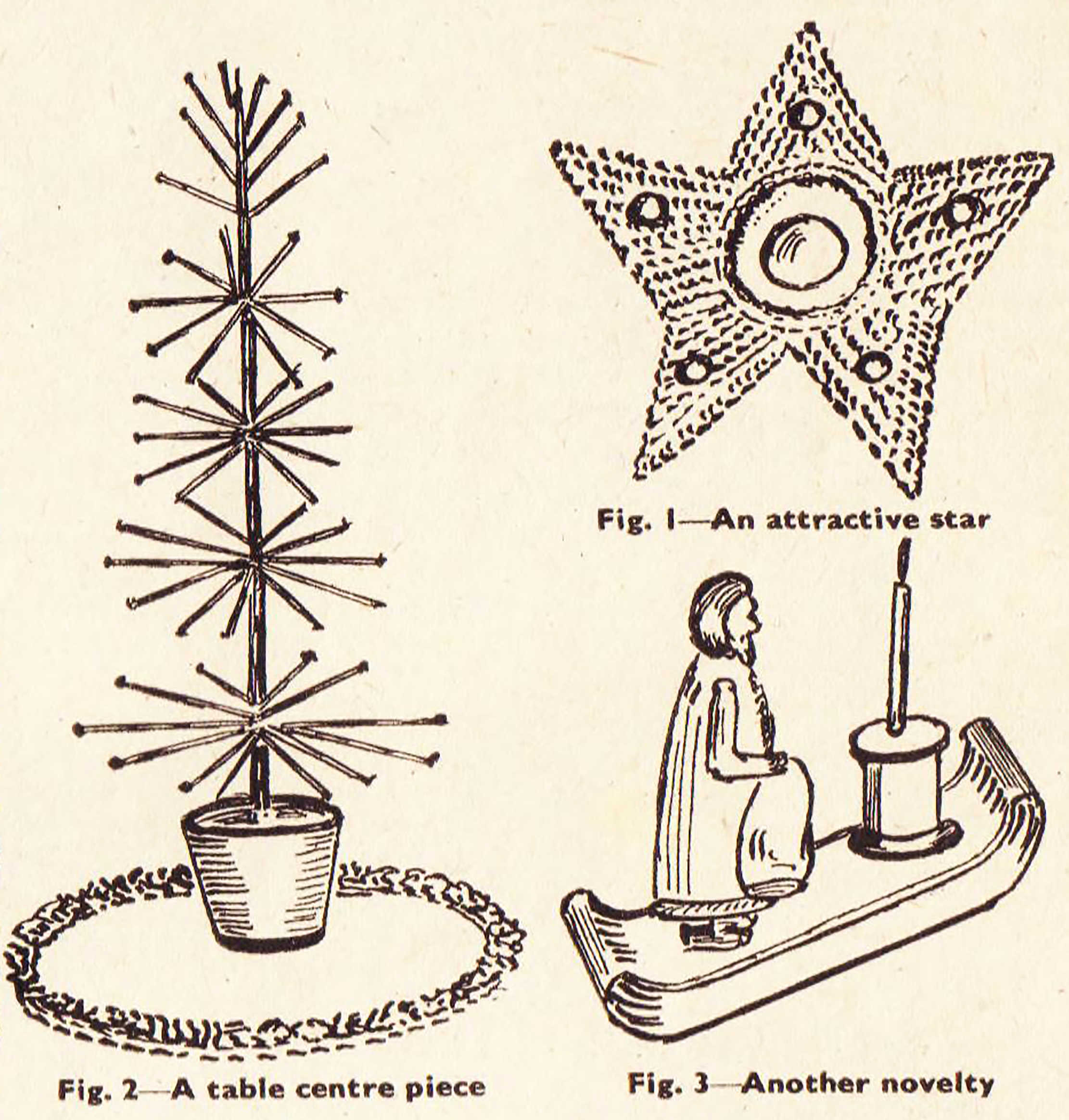 Answers: The doll is upside down in the foreground twigs. The mother's face is upside down at the base of the big pine tree. The rabbit stands in the twigs behind the girl's legs. The girls' sleeve is Santa's hat, with his face being her hand and his beard being a pine branch. From Wee Wisdom, 1930.