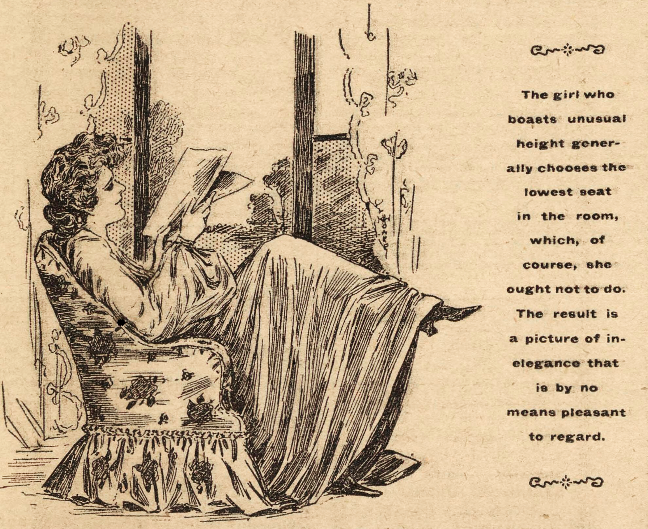 Advice to tall women not to take low seats so as to avoid inelegance.  From Daily Mirror, 1905.