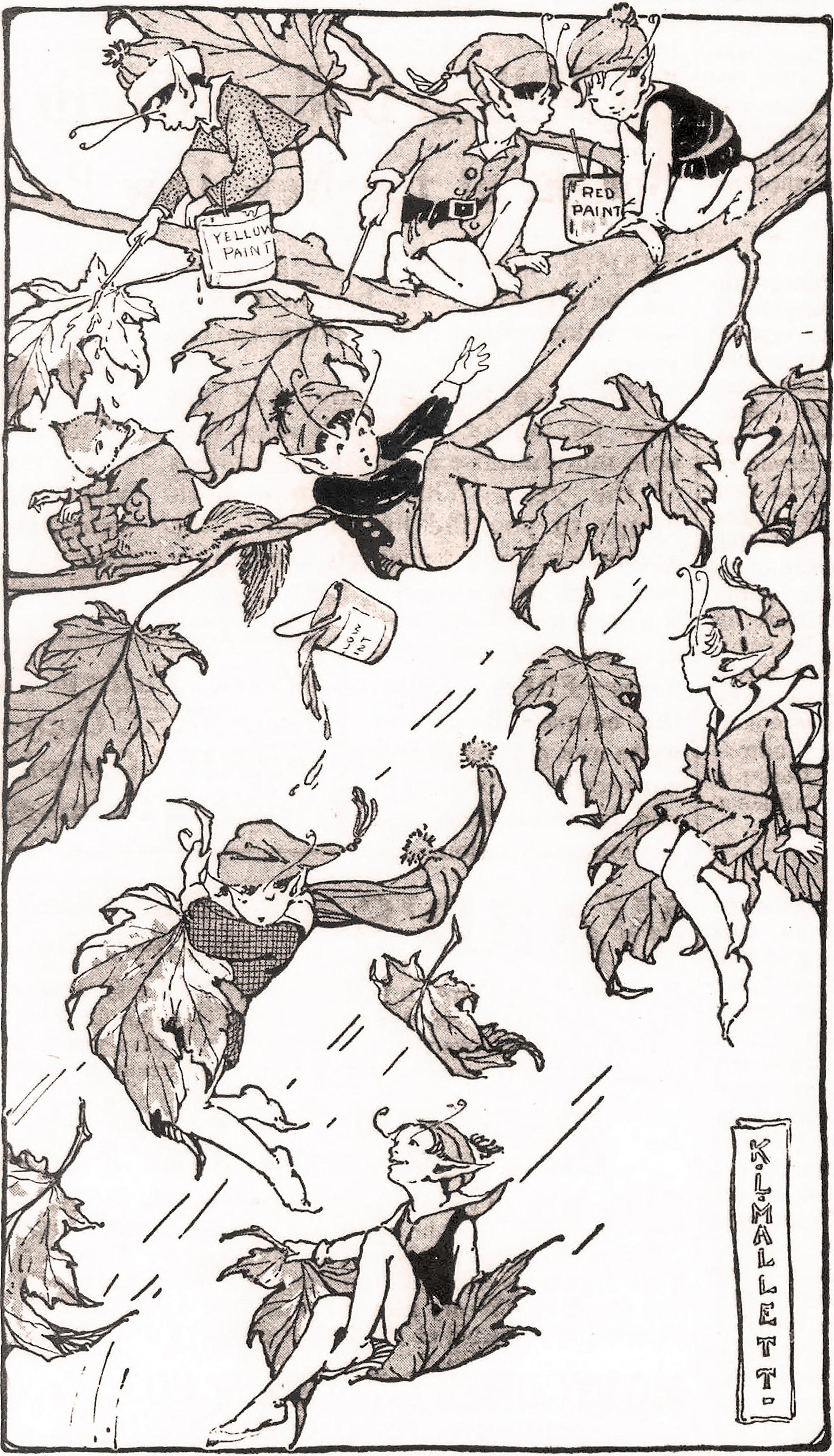 #vintage illustration #elf #autumn #leaf #1920s #illustration #up a tree #fall colors #falling leaves