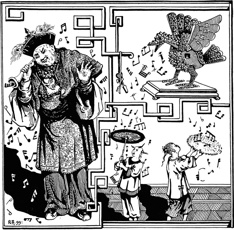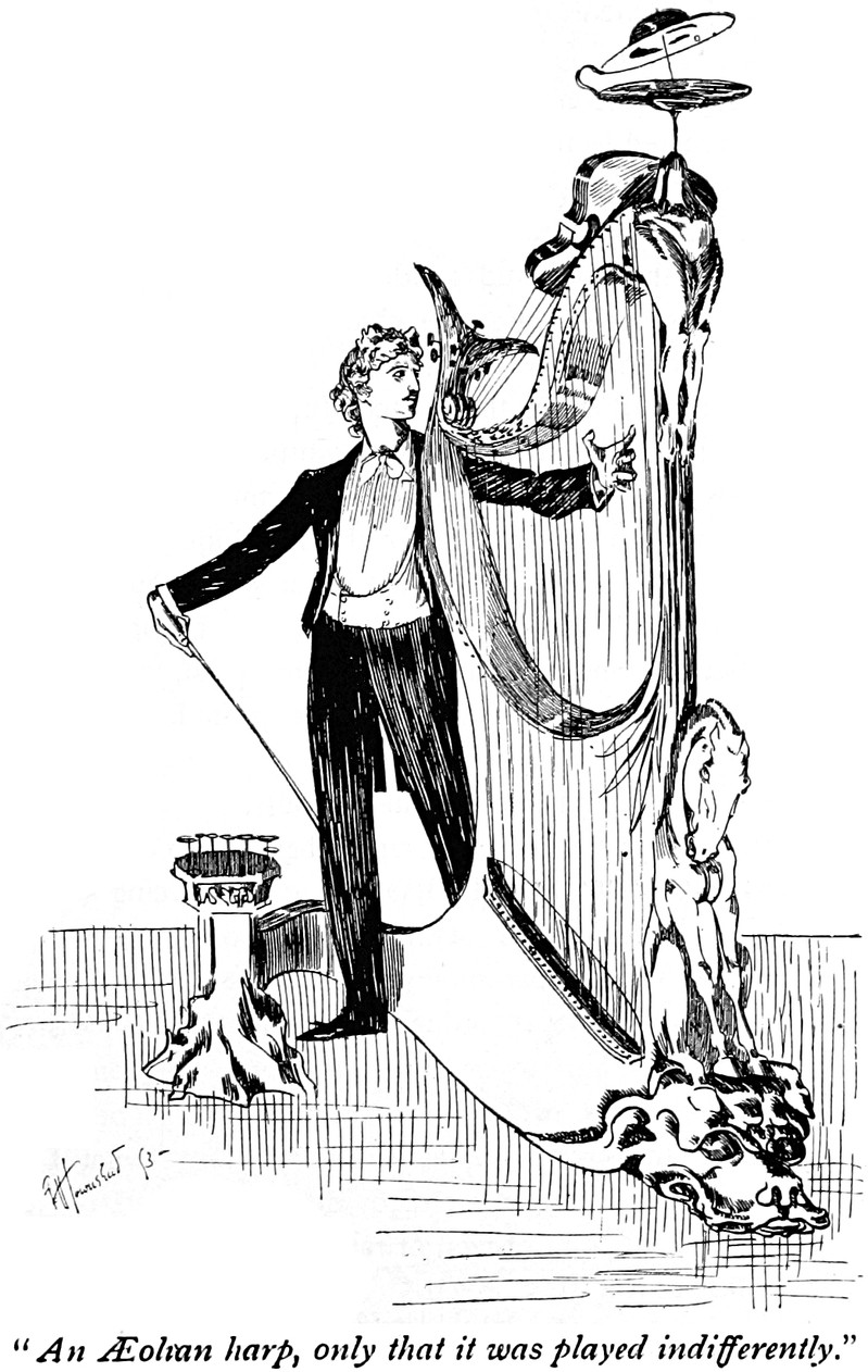 "The Eldest Generosity girl bounces about a good deal on the music stool and plays wrong notes maliciously." From The Money-Spinner by Henry Seton Merriman and illustrated by Arthur Rackham, 1896.