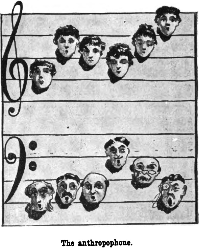 The "anthropophone" is a musical parlor game featuring a decorated bed sheet incribed as a sheet of music.  Holes are cut for the heads of singers to stick out, each representing one note.  As a song is played, each performer seeks to intone his or her note as it occurs -- to generally hilarious results.  From Pearson's, 1897.