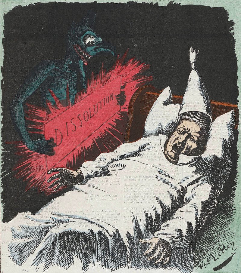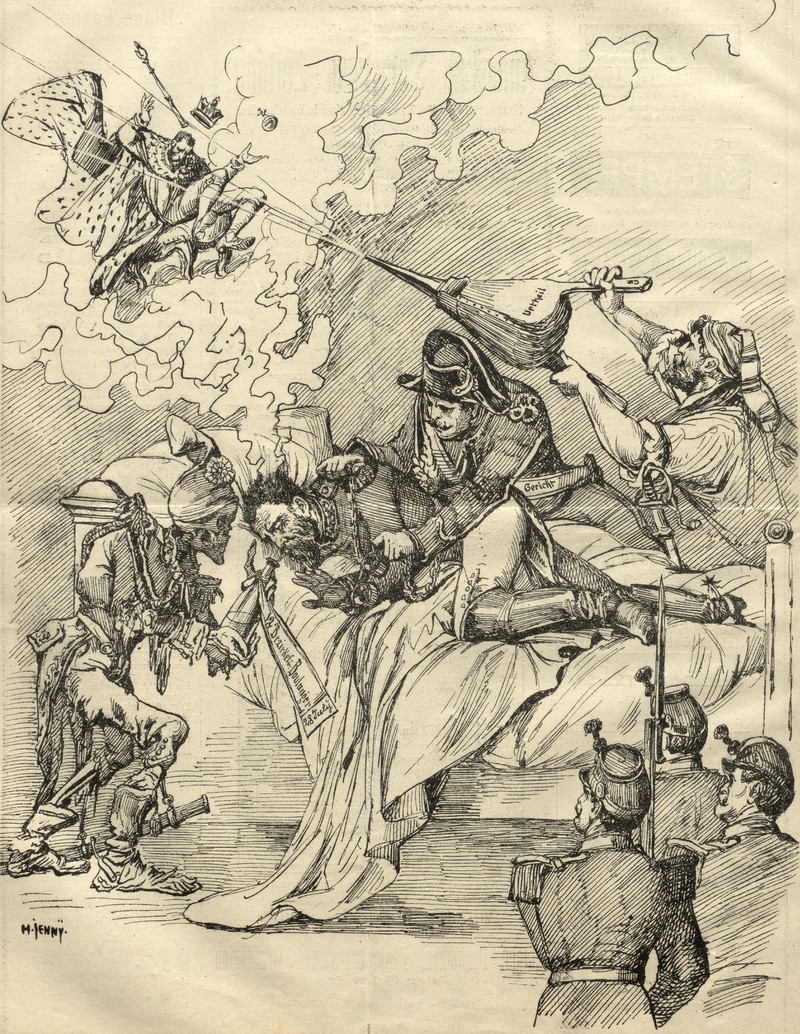 A carnivore's dream but a vegetarian's nightmare -- a land where sausages grow on trees and cooked pigs frolic with apples in their mouths and cutlery in their loins. From Lustige Blätter, 1902.