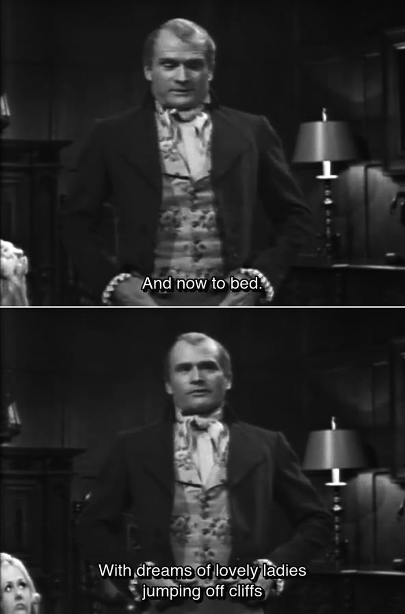 "And now off to bed, with dreams of lovely ladies jumping off cliffs."  From Dark Shadows episode 281.
