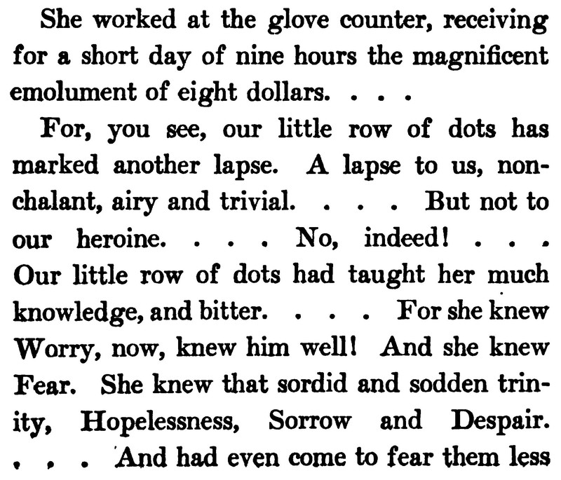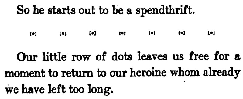 Long-term ex-readers of ours will recall that we love interpreting rows of section-break dots and asterisks as illustrations for the text above or below them. (In fact, we published an entire book of such interpretations, Annotated Ellipses: Revealing A Hidden Dot-To-Dot Game Within A Novelist's Eccentric Punctuation). But here's an example of the very opposite. The narrator experiences a roadside accident and sees fifty million stars, then notes that the row of asterisks does not represent said stars but rather a period of unconsicousness. From Pearson's, 1904.