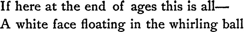 "If here at the end of ages this is all—a white face floating in the whirling ball." From "A Leaf from the Devil's Jest-Book" by Edwin Markham, in The Man with the Hoe, 1899.