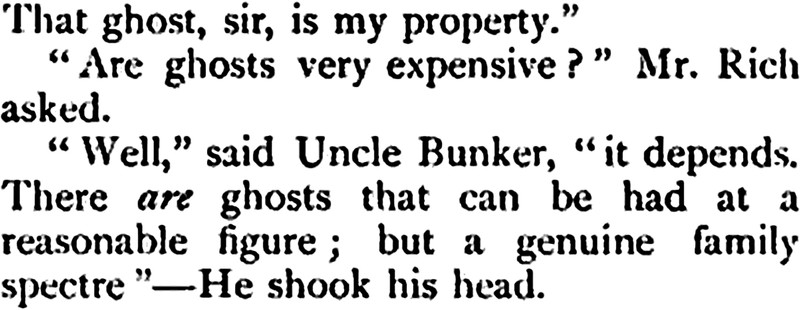 Here's the answer to how much it costs to get an ancestral spirit to lend tone to a place. "It depends." From "Uncle's Ghost" by Owen Oliver, in The London Magazine, 1902.
