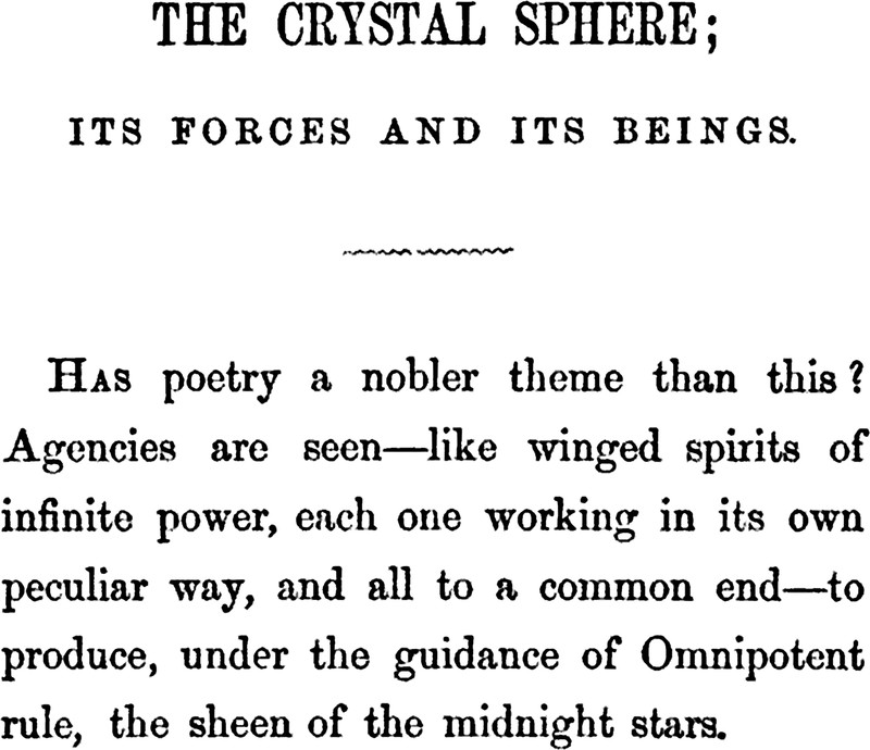 Though these words apply eerily to a crystal ball, J. Milton Sanders is actually referring to a drop of water in The Crystal Sphere, Its Forces and Its Beings, 1857. "Agencies are seen—like winged spirits of infinite power, each one working in its own peculiar way, and all to a common end—to produce, under the guidance of Omnipotent rule, the sheen of the midnight stars."