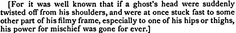 Here we learn that "if a ghost's head were suddenly twisted off from his shoulders, and were at once stuck fast to some other part of his filmy frame, especially to one of his hips or thighs, his power for mischief was gone for ever." From The Complete Poetical Works of Theodore Tilton, 1897.