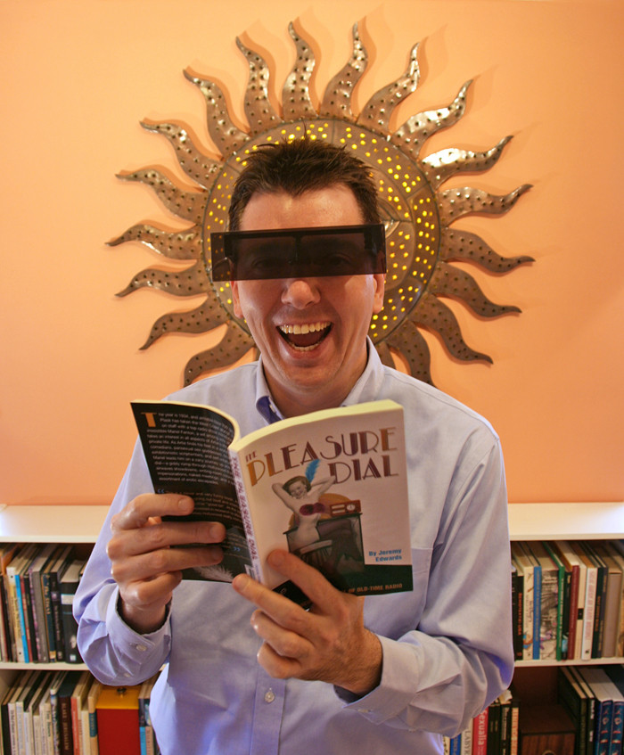 We're reading a bawdy farce of old-time radio ( The Pleasure Dial by Jeremy Edwards), and the spectacles are one of the tools we use whenever we delve into material from (or set in) the past (to help filter and focus the mists of time, naturally). What has us so delighted? It's a passage in Chapter 22, involving imaginary water. (Jeremy Edwards is the first author we've encountered who is witty enough to make a glass of water hilarious.) Here are the lines, though we mustn't explain the context lest we ruin a plot twist: The last time she’d been here, she’d been in the company of a Dada composer she was sleeping with, who wanted to see his sister carry a bucket across the stage in a rustic allegory. Not a memorable role for the poor young woman, who had not yet graduated to 'ingenue'; but to her credit she had not spilled a drop of the imaginary water, and Mariel had duly congratulated her.