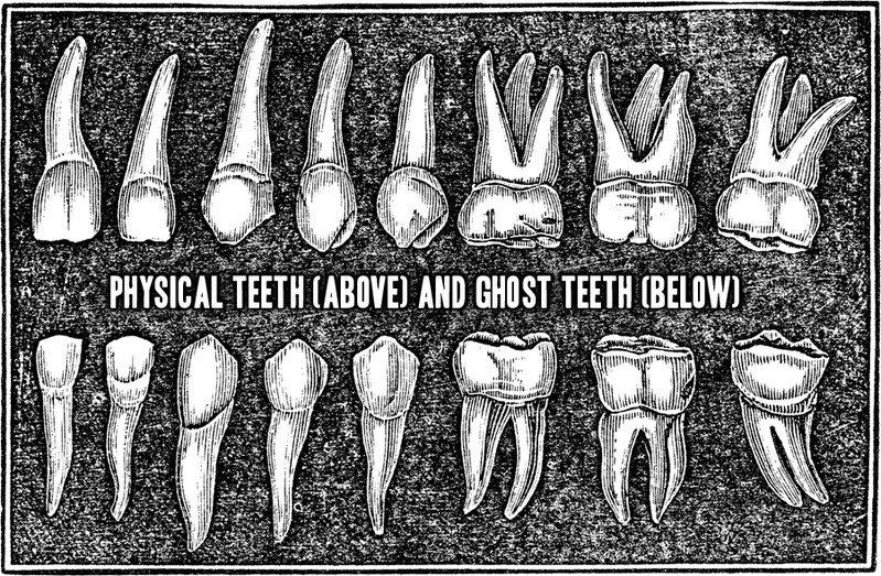 Ghost teeth (what Goethe called Geisterzahn) are neutral entities, neither quite divine nor satanic, equally good and bad. "Their realm may be beyond human rationality, but it is not inaccessible to human experience. [Ghost teeth] have their home in the imagination. Neither concrete, i.e. empirically verifiable, nor rational, they inhabit the above and below of human rationality. They are a concrete experience of the non-concrete in the mind, an imaginary concretisation of extra-rational phantoms" (Maike Oergel, Culture and Identity: Historicity in German Literature and Thought 1770-1815, 2006, p. 241). We wrote a macabre tale about ghost teeth, and it appears in the Spooky Tales ebook. From Prof. Oddfellow's sketchbook: