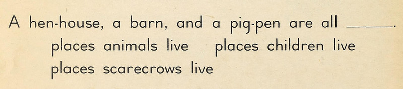 "A hen-house, a barn, and a pig-pen are all [places animals live / places children live / places scarecrows live]." From We Can Read The Toy-box by Gerrard & McInnes and illustrated by Connie Jefferess, undated (c. 1960).