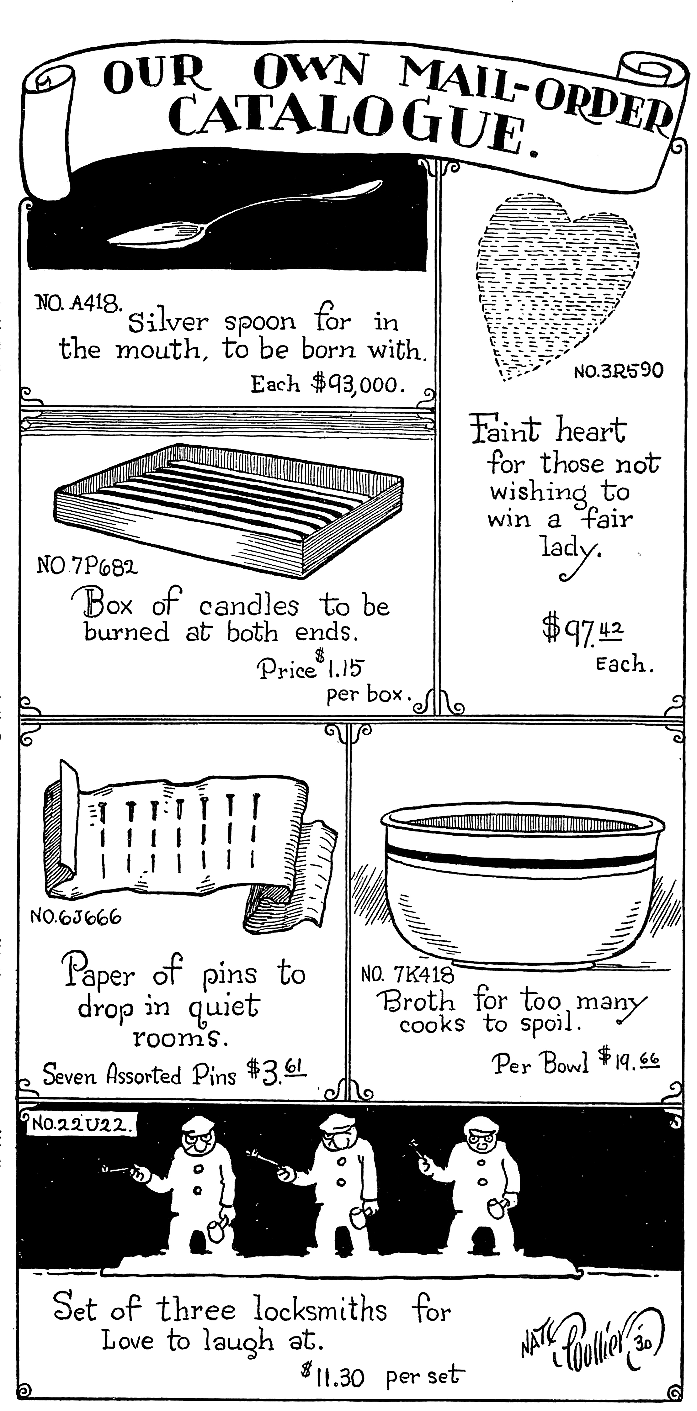 Adjusted for inflation, the silver spoon is $1,800,000, the faint heart is $1,880, the two-ended candles are $20, the pins to drop are $70, the broth for too many cooks is $380, and the three locksmiths are $220. From Life, 1930.