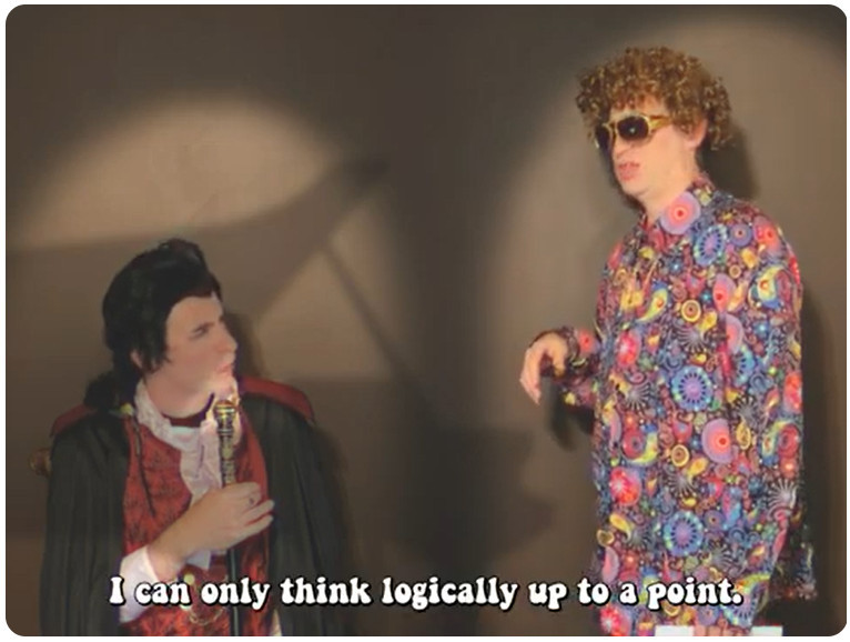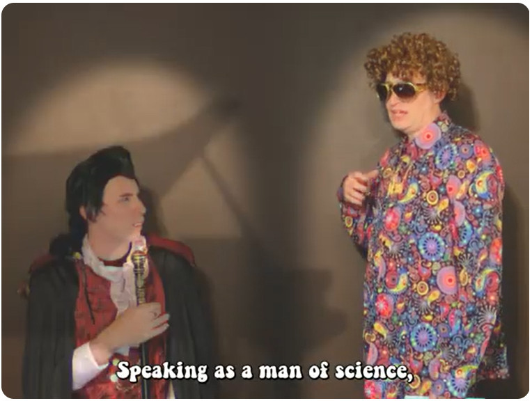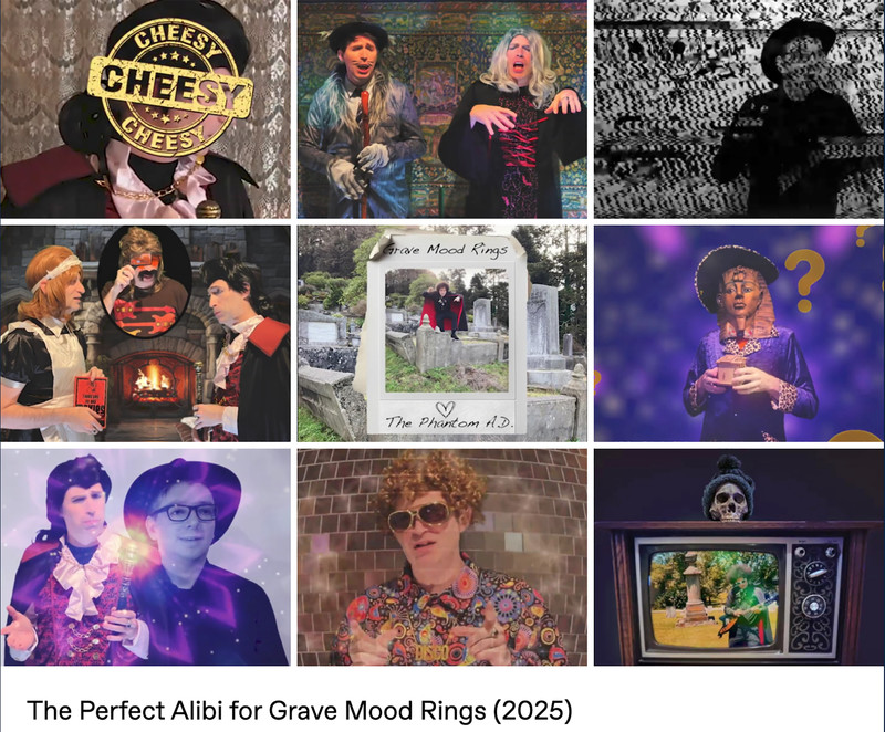 Parody analog horror meets 1970s tropes (like pet rocks, lava lamps, disco music, bell-bottom pants, mirror balls, and of course mood rings) in the web series Grave Mood Rings. It pokes fast fun at classic slow-moving Gothic soap operas like Dark Shadows and the Canadian series Strange Paradise. In addition to a vampiric Viscount, a castle is home to a groovy Doctor (a phlebotomist, naturally), a jolly housekeeper with her own laugh track, a werewolf Vicar, and an arch-nemesis riddler wearing a Sphinx mask. Corny wordplay, the occasional bizarre sing-a-long, and haunted doughnuts punctuate the proceedings, in the tradition of the sketch comedy of MadTV, Kids in the Hall, and SCTV.