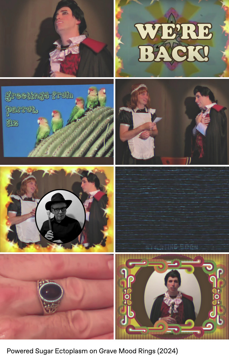 Parody analog horror meets 1970s tropes (like pet rocks, lava lamps, disco music, bell-bottom pants, mirror balls, and of course mood rings) in the web series Grave Mood Rings. It pokes fast fun at classic slow-moving Gothic soap operas like Dark Shadows and the Canadian series Strange Paradise. In addition to a vampiric Viscount, a castle is home to a groovy Doctor (a phlebotomist, naturally), a jolly housekeeper with her own laugh track, a werewolf Vicar, and an arch-nemesis riddler wearing a Sphinx mask. Corny wordplay, the occasional bizarre sing-a-long, and haunted doughnuts punctuate the proceedings, in the tradition of the sketch comedy of MadTV, Kids in the Hall, and SCTV.