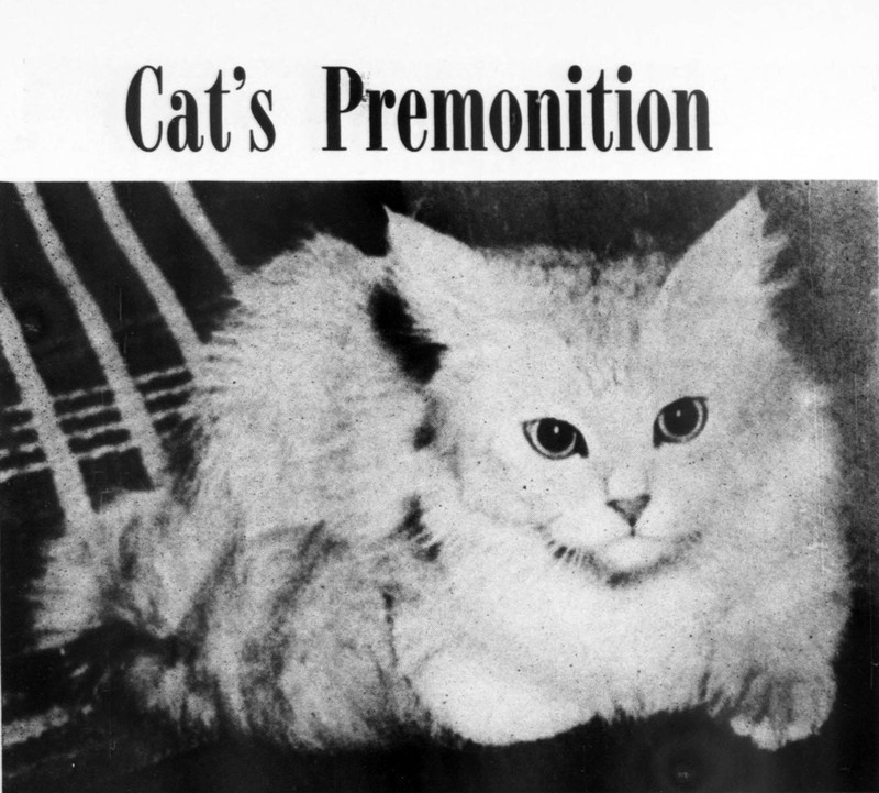 Through the mists of time, this cat had a premonition about you. From the Massachusetts Society for the Prevention of Cruelty to Animals' Our Dumb Animals magazine, 1953.