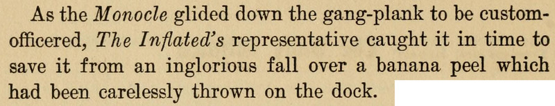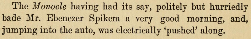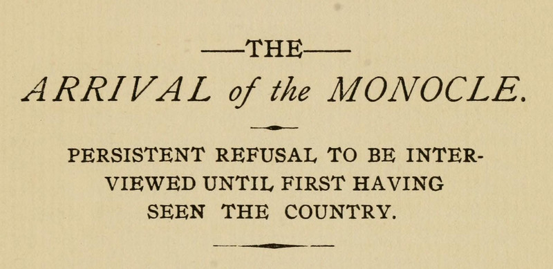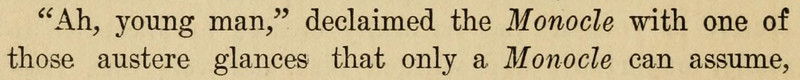 Lots of fun anthropomorphized monocle business here, including a glass wafer nearly slipping on a banana peel, and a patch of crystal giving austere glances and objecting to being bored. Also, don't miss the unusual word "zeroatic" to describe an ice-cold greeting. From Interviews with a Monocle by Leopold Jordan, 1902.