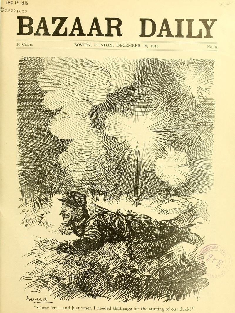 Ironic, paradoxical, and instructive -- finding something beautiful to focus upon in the midst of horror. "Curse 'em -- and just when I needed that sage for the stuffing of our duck!" From Bazaar Daily, 1916.
