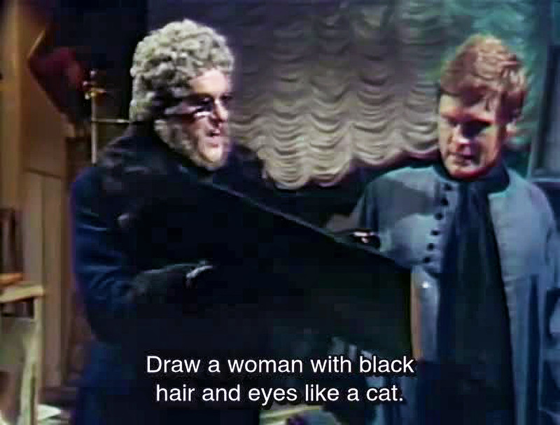 "Draw a woman with black hair and eyes like a cat."  From Dark Shadows episode 851.