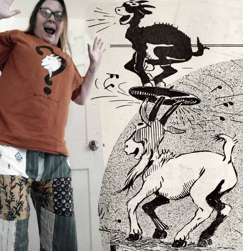 Showing us how it's done, here's a superfan of Prof. Oddfellow's Penetralia living the life and working the magic with our signature "Butt in and See" t-shirt. Thank you, A-Smo, for rocking this look and for sustaining the dream! (P.S. We love the spot-on impersonation of Prof. Oddfellow being scared out of his wits by a bleating goat!)