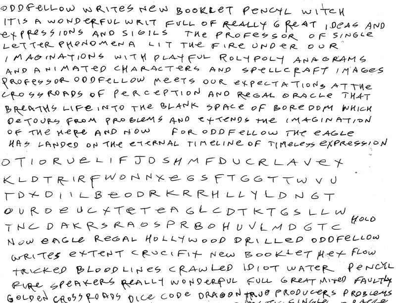 Oddfellow writes new booklet Pencil Witch. It is a wonderful writ full of really great ideas and expressions and sigils. The professor of single letter phenomena lit the fire under our imaginations with playful rolypoly anagrams and animated characters and spellcraft images. Professor Oddfellow meets our expectations at the crossroads of perception and regal oracle that breathes life into the blank space of boredom which detours from problems and extends the imagination of the here and now. For Oddfellow the eagle has landed on the eternal timeline of timeless expression.