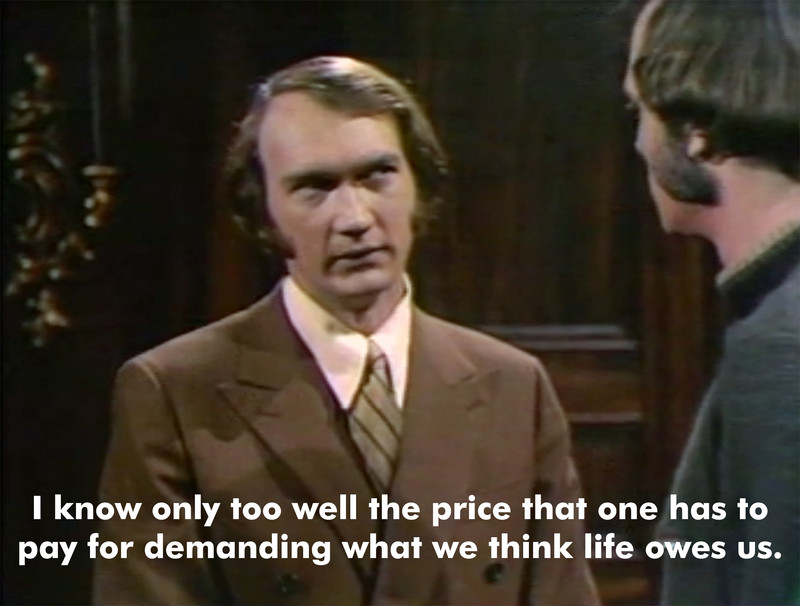 "I know only too well the price that one has to pay for demanding what we think life owes us." From Canada's answer to Dark Shadows, Strange Paradise episode 155.