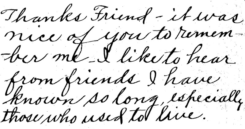 A spirit message from one Lucy Hoar in 1941. The handwriting reads, "Thanks Friend — it was nice of you to remember me. I like to hear from friends I have known so long, especially those who used to live."