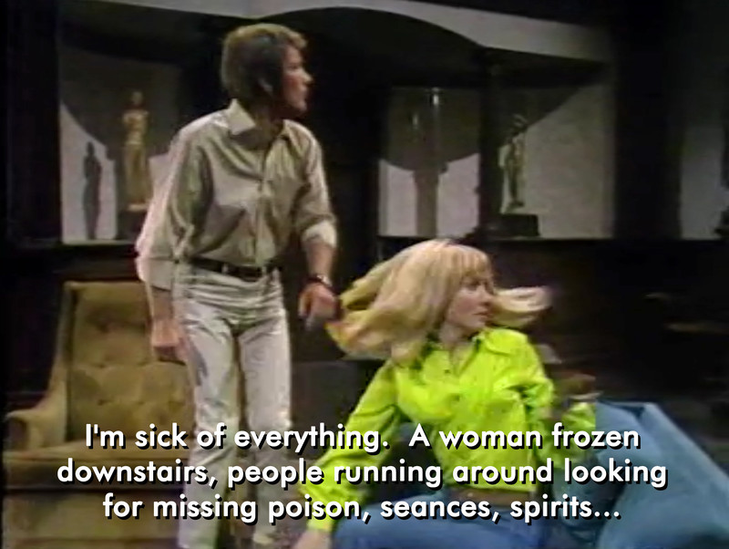 "I'm sick of everything. A woman frozen downstairs, people running around looking for missing poison, seances, spirits..." From Canada's answer to Dark Shadows, Strange Paradise episode 37.