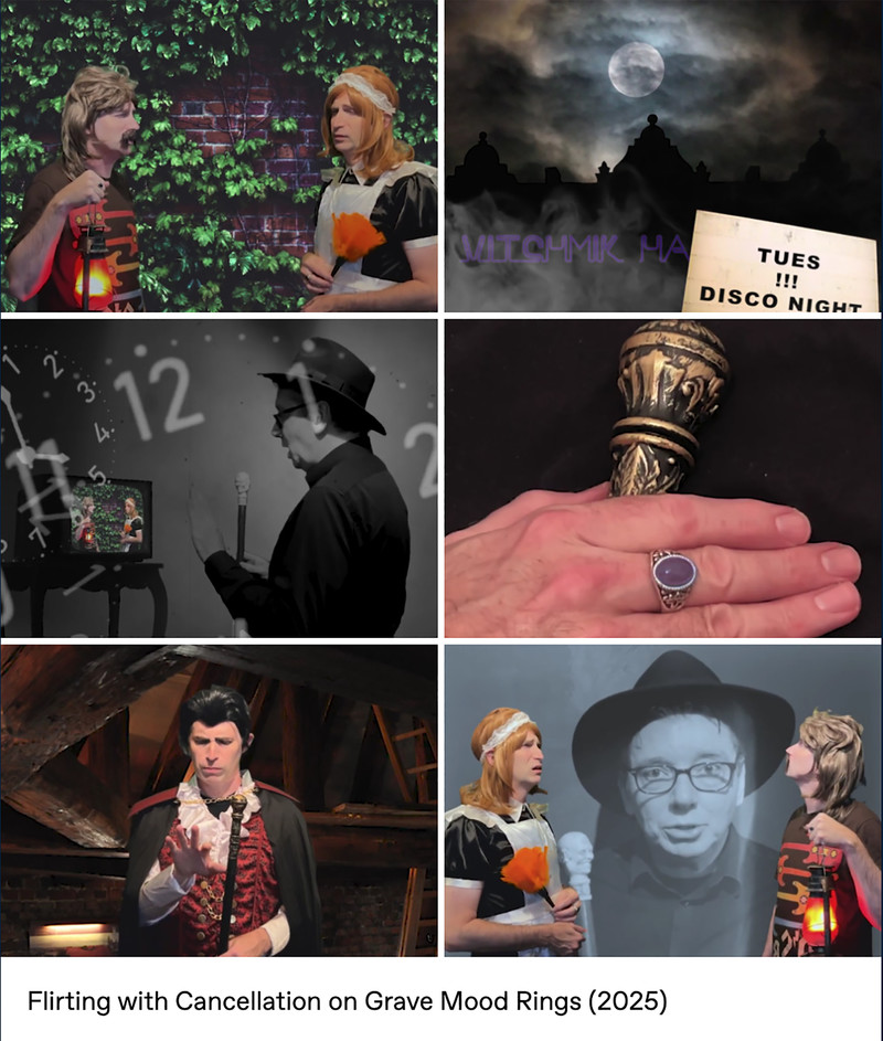 PROF: My partner and I began recording and releasing electronic dance music in the mid-1990s and ran our own record label for years. We invented the haunted clockwork / Tesla spirit radio genre and still record such as Neons Gone Mad. For Grave Mood Rings, we first seek to collaborate with old and new friend, preferring to add our own lyrics to pre-existing or custom instrumentation. I also like to homage favorite tracks through whimsical cover versions. Most of the Grave Mood Rings songs — surely over 60 this point — tend more toward jingles because we like to keep the proceedings snappy. Due to the 1970s setting, it's supposed to all be Disco, but we end up doing whatever feels right at the moment. We probably spend as much time on sound design as on the visual editing.