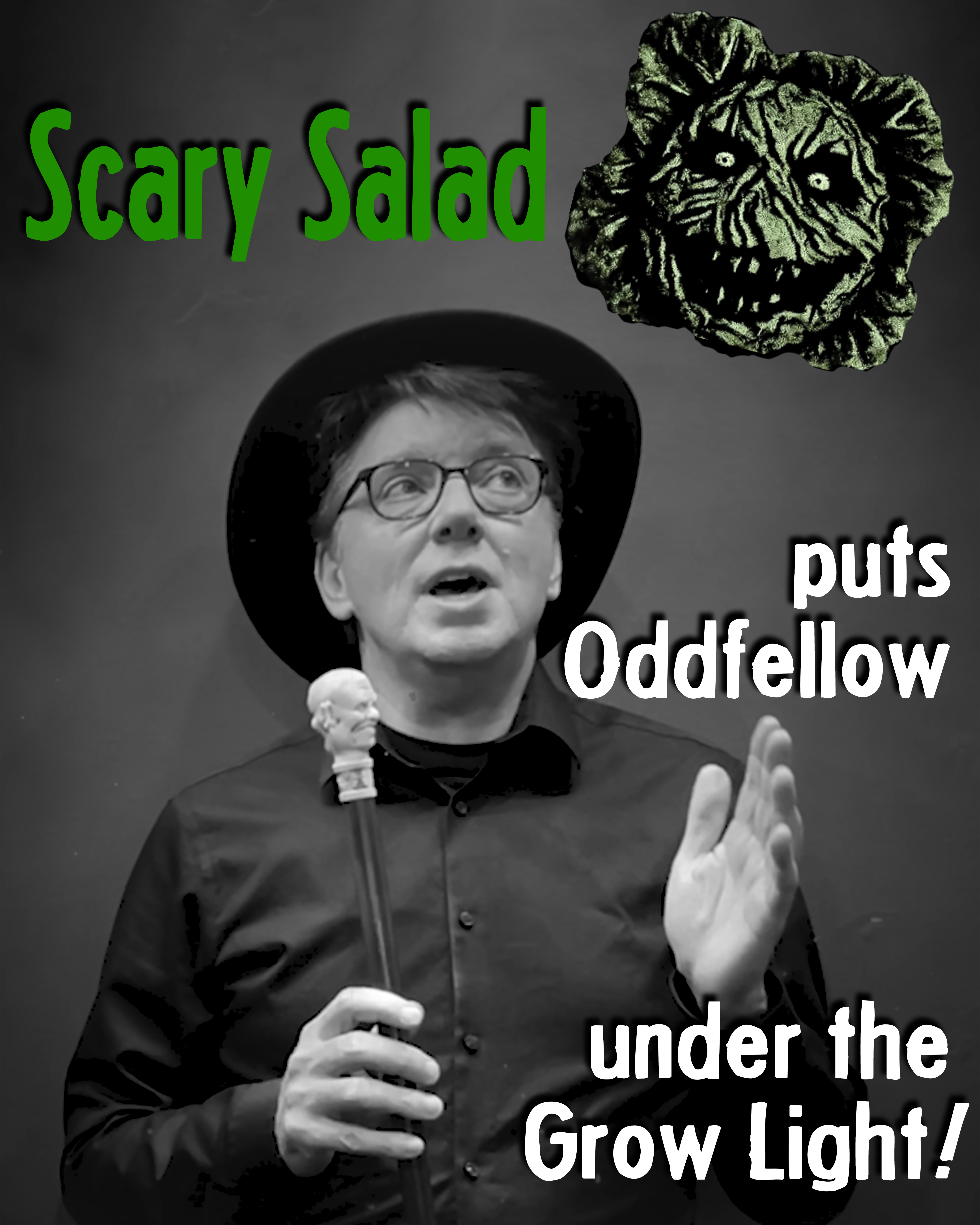 PROF: We have a troupe of writers and a backlog of unproduced scripts, so the arrival of a new horror host bumper clip tends to motivate us to pair it with a script or to write a new accompanying story. I'm extraordinarily inspired by collaborations and by viewer comments and suggestions. We basically "do requests." Because we have only one actor to play all the roles except for my Prof. Oddfellow character, we must film each element separately with an eye toward the compositing process. The assembly and post-production requires about 3 hours per completed minute of footage.