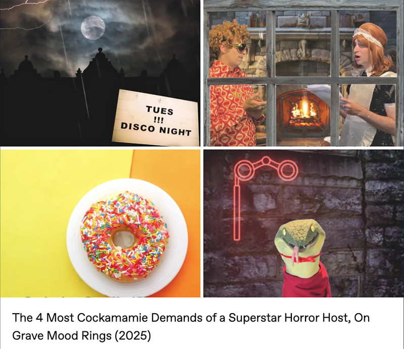 Parody analog horror meets 1970s tropes (like pet rocks, lava lamps, disco music, bell-bottom pants, mirror balls, and of course mood rings) in the web series Grave Mood Rings. It pokes fast fun at classic slow-moving Gothic soap operas like Dark Shadows and the Canadian series Strange Paradise. In addition to a vampiric Viscount, a castle is home to a groovy Doctor (a phlebotomist, naturally), a jolly housekeeper with her own laugh track, a werewolf Vicar, and an arch-nemesis riddler wearing a Sphinx mask. Corny wordplay, the occasional bizarre sing-a-long, and haunted doughnuts punctuate the proceedings, in the tradition of the sketch comedy of MadTV, Kids in the Hall, and SCTV.