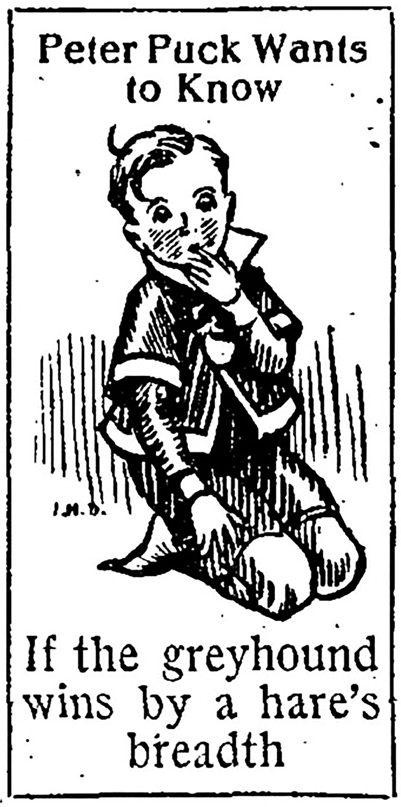 "Peter Puck wants to know if te greyhound wins by a hare's breadth." From The Children's Newspaper, 1927.