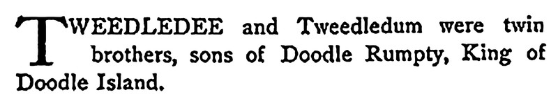 "Tweedledee and Tweedledum were twin brothers, sons of Doodle Rumpty, King of Doodle Island." From Wide Awake, 1880