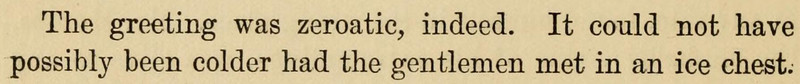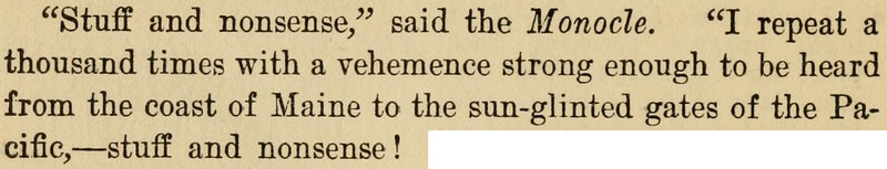 Lots of fun anthropomorphized monocle business here, including a glass wafer nearly slipping on a banana peel, and a patch of crystal giving austere glances and objecting to being bored. Also, don't miss the unusual word "zeroatic" to describe an ice-cold greeting. From Interviews with a Monocle by Leopold Jordan, 1902.
