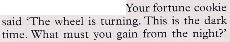 "Your fortune cookie said 'The wheel is turning. This is the dark time. What must you gain from the night?" From The Christmas Cookie Club by Ann Pearlman.