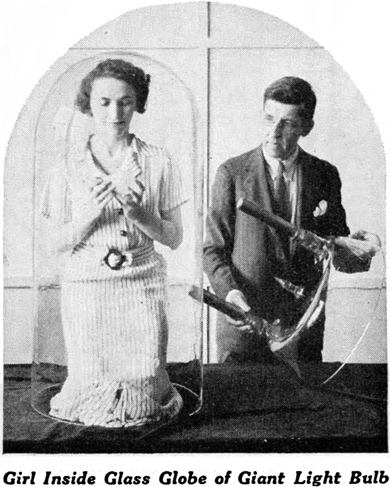 "Girl inside glass globe of giant light bulb."  From Popular Mechanics, 1934.