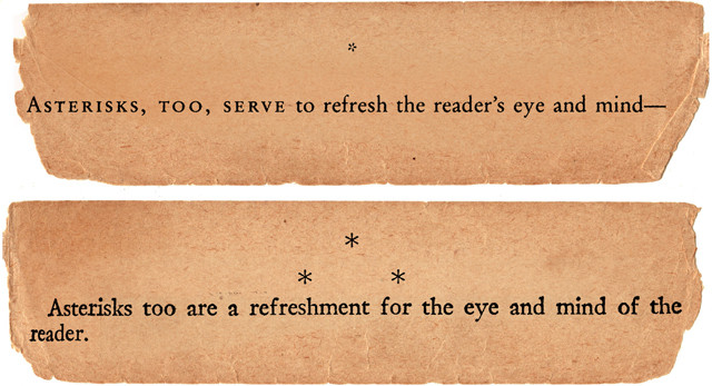 (Part one of a research/collage project inspired by Chris Piuma and dedicated to Geof Huth. Thanks to Gordon Meyer for invaluable support.) Top clipping from John E. Woods' translation of Doctor Faustus by Thomas Mann (Vintage International Edition, 1999). Middle clipping from H.T. Lowe-Porter's translation of Doctor Faustus by Thomas Mann (Knopf, 1948). Bottom clipping from Johann Wolfgang von Goethe's Faustus (Boosey & Sons, 1821) --- Carson Park Ranger writes: Asterisks seem to exist only on hand-held devices anymore where, sadly, they are referred to as star.