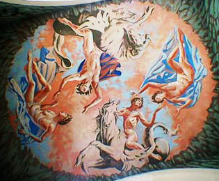 An Animated Collage of a Hans Freibusch MuralAt the fairy-tale Welsh village of Portmeirion, Hans Feibusch's classical-style ceiling mural graces the archway of the Gate House. The figures are pagan deities, reminiscent of ancient zodiacal personages at play in the heavens. Acrobatically tumbling through the ethers, one figure atop a horse reaches out to join hands with another whose cape billows like a parachute. Though their fingers haven’t yet touched, their eyes are locked. The composition suggests a Yin/Yang balance and a clockwise cyclical flow. These figures may symbolize a connection, bonding, or affinity. They epitomize the quest for the Other that stretches us as human beings, at the risk of breaking our hearts. The mural is too large to be photographed in a single frame. We have animated the reconstruction of the complete image from 23 separate photographs. Click here to choose your perspective.