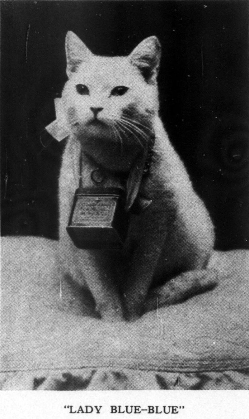 Lady Blue-Blue begged for charity with a coin bank around her neck. From the Massachusetts Society for the Prevention of Cruelty to Animals' Our Dumb Animals magazine, 1916.