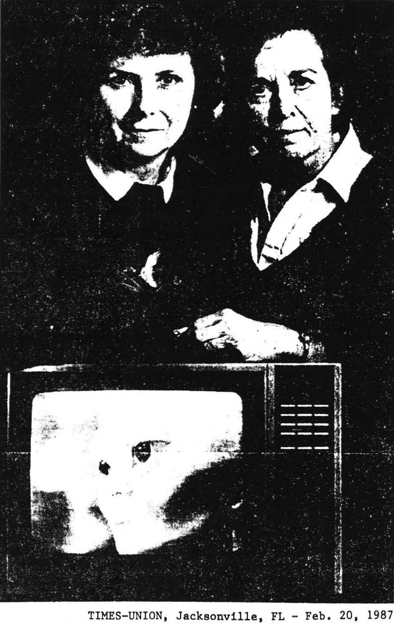 Even with an uncanny antenna, we don't get the TV channel pictured here. Couldn't find much about these women online, but Lydia Stalnaker and Jean Branson founded a UFO club in Jacksonville, Florida. From UFO Newsclipping Service, 1987.
