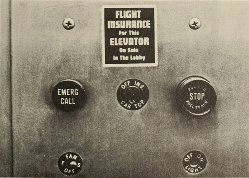 The sign says, "Flight insurance for this elevator on sale in the lobby."  With insurance costs what they are nowadays, if the elevator just keeps on going, one has no recourse.  From Presbyterian College's 1969 yearbook.
