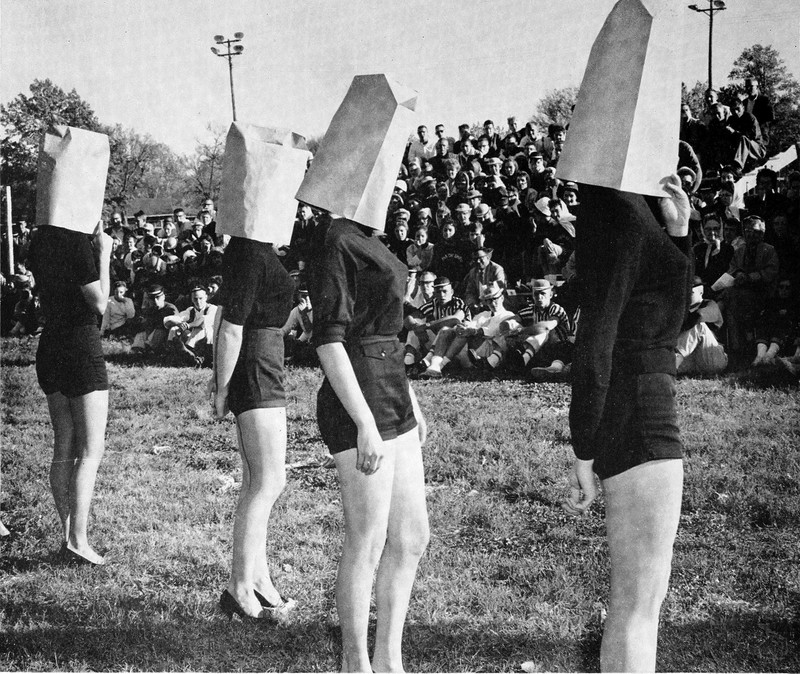 This photo is unexplained in the yearbook. You may not wish to enlarge the photo to see his ghostly eyes. We tried to narrow down the model of typewriter he's holding … presumably an Underwood, though the lip on the back seems too pronounced. From Swarthmore's 1912 yearbook.