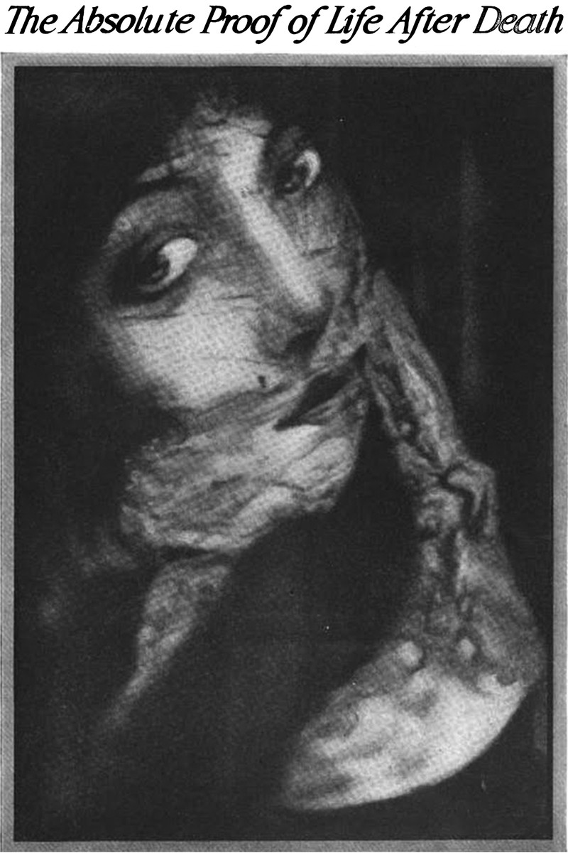 "The absolute proof of life after death." "Photograph of a materialized spirit face in formation, showing the unused viscous stuff called sctoplasm that issued from the medum 'Eva' to create these ghostlike forms. Photographed by Dr. Geley of Paris." From Hearst's International, 1921.