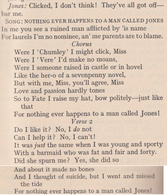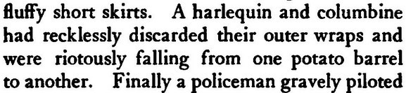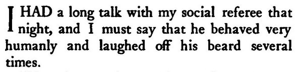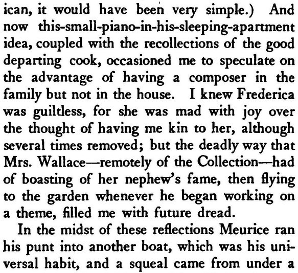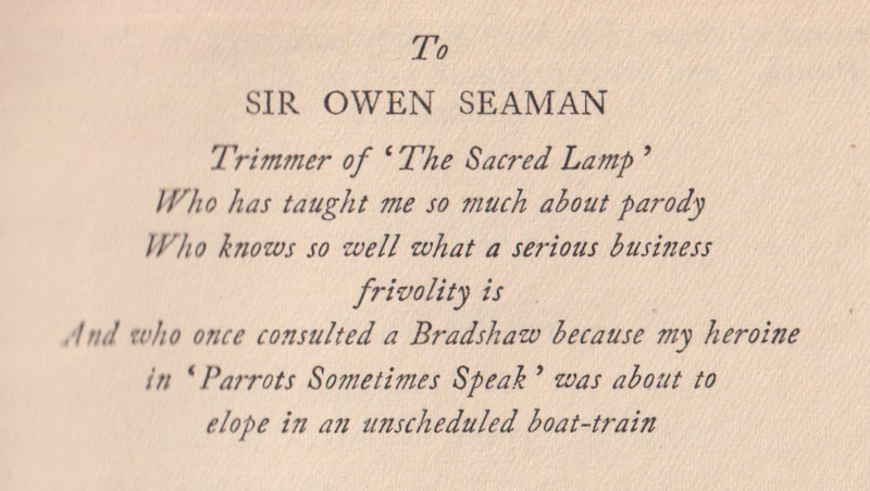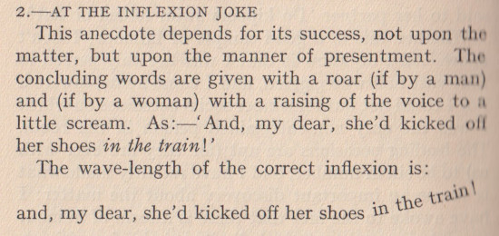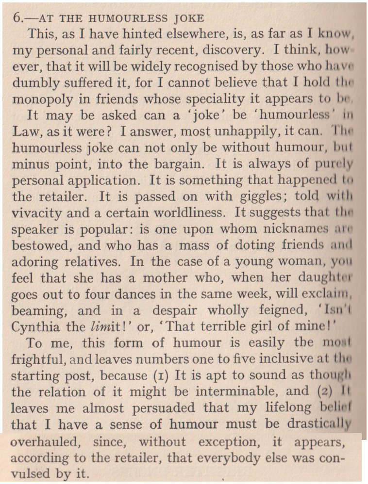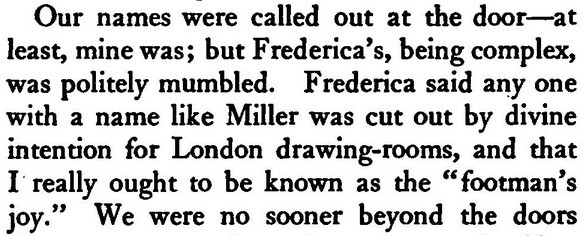 Of my childhood, I remember how the Baron Pumpernickel...once sprang into our play-room and said (addressing myself), "How do you do?" This bon-mot, I am told, went the rounds of the clubs. I became known as The Girl Who Was Asked How She Did. [...] Lord Scribblesdull....Dear Scribbly! as we all called him. [...] My father was a great wit, a really gifted raconteur. He would keep a whole dinner-table in a roar. Even the sideboard groaned....We called my father "Flopit"--I don't know why. [...] I was acting as hostess to Lord Buttonhead. ***