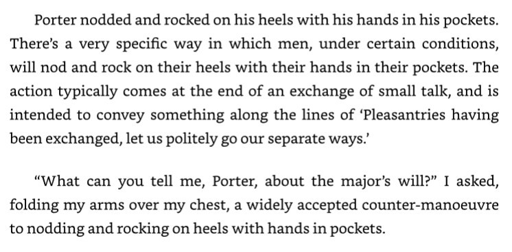***Both wings are two stories high and in the Perpendicular Gothic style, so a lot of frightful gargoyles perched on top of vertical beams, looking down on one as if the whole affair is somehow one's fault.***Between the wings is...a granite statue long since worn to a nub by the elements, depicting either George Slaying the Dragon or the Birth of Venus.***"May I offer you my condolences, sir"...."You may, Carnaby, so long as you don't mind me pocketing them for later consumption. I barely knew the man."***very much in the mould of...your Friars Tuck***"We called him Fiddlesticks, for Fairfax."***His aged face...was a pastiche of emotion ranging from insouciance to indifference.***"You look enough alike to be close friends or acquaintances."***"So, how are you holding up?" I asked. "Anything a vacuous young bachelor with little to no life experience can offer in terms of comfort and support?"***"It was a cherished gift," said Laetitia, who had recovered her composure and gathered it into a state of high dudgeon.***"I was referring to the painting, about yay big..." I held my hands up, indicating a rectangle the size of a "yay," whatever that may be.***He put his drink on the table between us, freeing up his hands to fidget independently.***"Mr. Boisjoly," called List Porter, the landlord, with equal parts pomp and circumstance.***Porter occupied the organic centre of a rhizomatic information network, the dichotomy of which was that he somehow knew more and knew it sooner than any of his sources.***"Stick to them like glue, Vickers," I said. "The inspector will be requiring their presence in the conservatory this afternoon, tea-ish. Stick to yourself like glue as well, you will also be required."***I tapped on the door and, sure enough, I was greeted with an amiable "Go away."***Ivor glared at me with an intensity that required his eyebrows to join forces.***